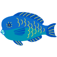 サンゴ礁の海のようなカラーリングの魚、イラブチャーのイラストです。市場でよく見かける魚で、刺身などにして食べます。刺身の場合、青い皮もそのまま出てくるので、初めて見る本土の人は驚くと思います。固い珊瑚をガリガリ食べられる、くちばしのような口も特徴的ですね。